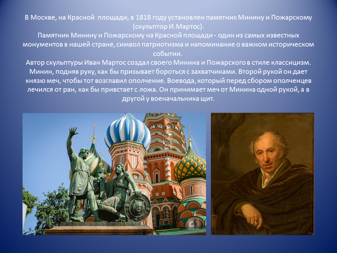 В Москве, на Красной площади, в 1818 году установлен памятник Минину и Пожарскому (скульптор И.Мартос). Памятник Минину и Пожарскому на Красной площади - один из самых известных монументов в нашей стране, символ патриотизма и напоминание о важном историческом событии. Автор скульптуры Иван Мартос создал своего Минина и Пожарского в стиле классицизм. Минин, подняв руку, как бы призывает бороться с захватчиками. Второй рукой он дает князю меч, чтобы тот возглавил ополчение. Воевода, который перед сбором ополченцев лечился от ран, как бы привстает с ложа. Он принимает меч от Минина одной рукой, а в другой у военачальника щит.