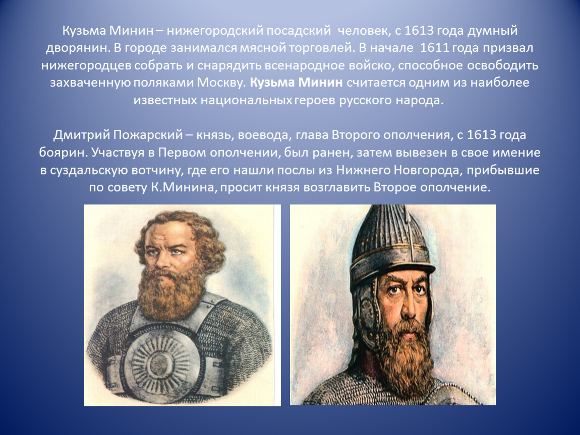 Кузьма Минин – нижегородский посадский человек, с 1613 года думный дворянин. В городе занимался мясной торговлей. В начале 1611 года призвал нижегородцев собрать и снарядить всенародное войско, способное освободить захваченную поляками Москву. Кузьма Минин считается одним из наиболее известных национальных героев русского народа. Дмитрий Пожарский – князь, воевода, глава Второго ополчения, с 1613 года боярин. Участвуя в Первом ополчении, был ранен, затем вывезен в свое имение в суздальскую вотчину, где его нашли послы из Нижнего Новгорода, прибывшие по совету К.Минина, просит князя возглавить Второе ополчение.