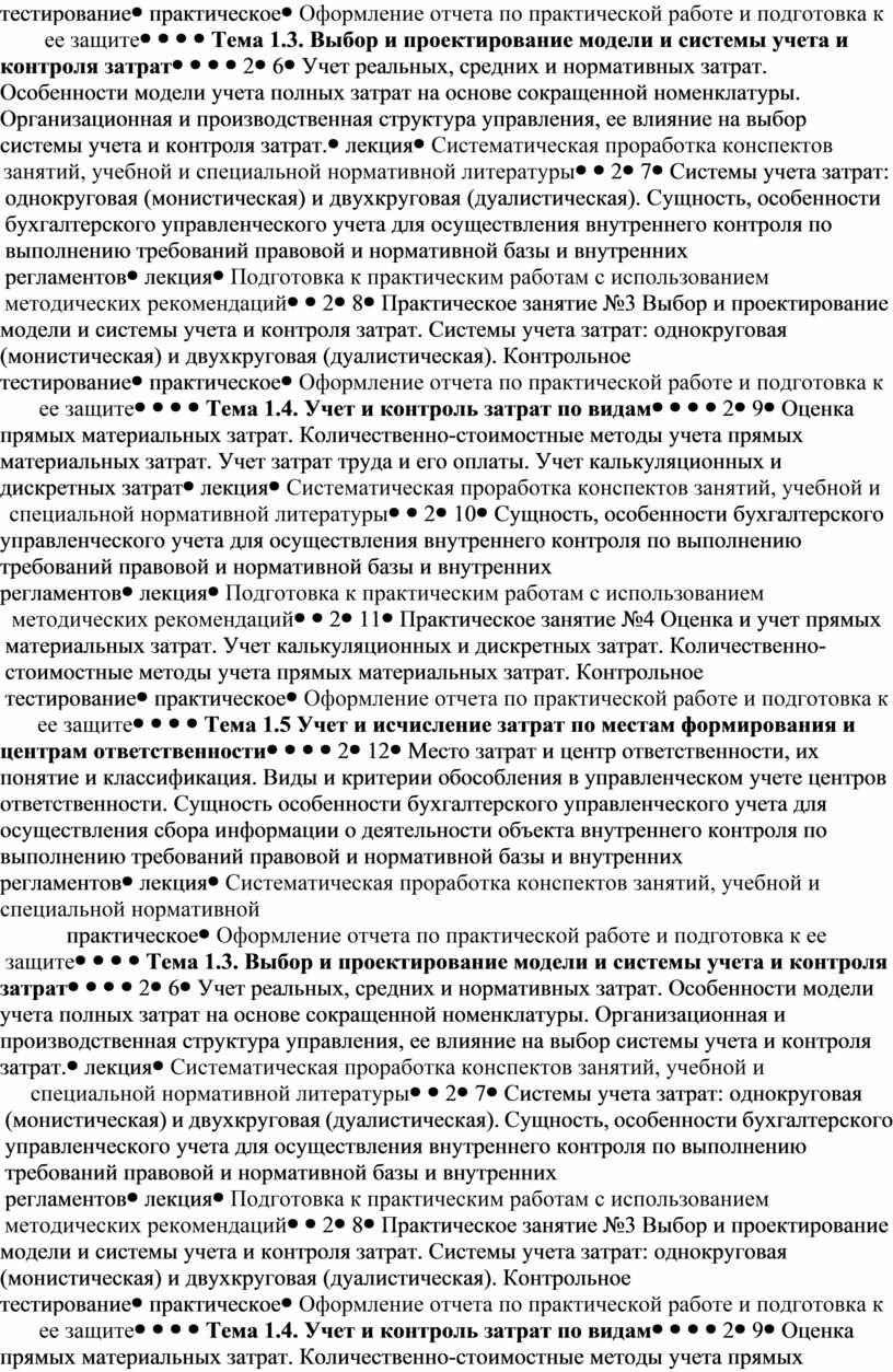 Практическое занятие №3 Выбор и проектирование модели и системы учета и контроля затрат. Системы учета затрат: однокруговая (монистическая) и двухкруговая (дуалистическая). Контрольное тестирование |