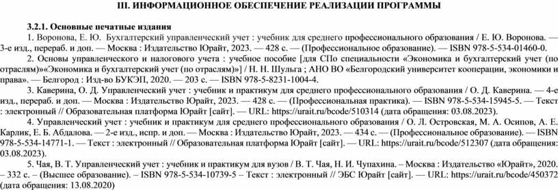 1. Воронова, Е. Ю. Бухгалтерский управленческий учет : учебник для среднего профессионального образования / Е. Ю. Воронова. — 3-е изд., перераб. и доп. — Москва : Издательство Юрайт, 2023. — 428 с. — (Профессиональное образование). — ISBN 978-5-534-01460-0.