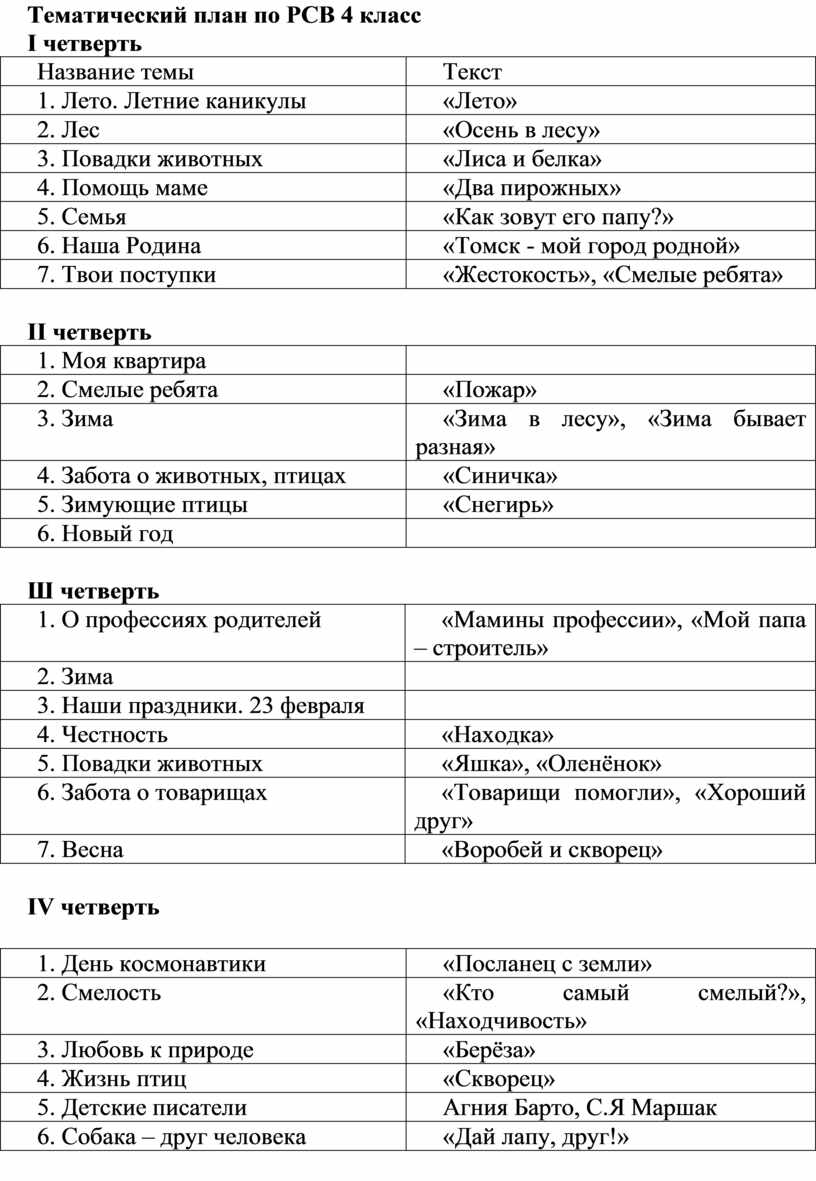 Тематический план по РСВ 4 класс