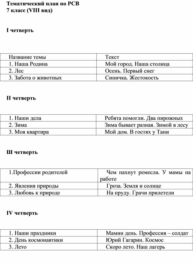 Тематический план по РСВ