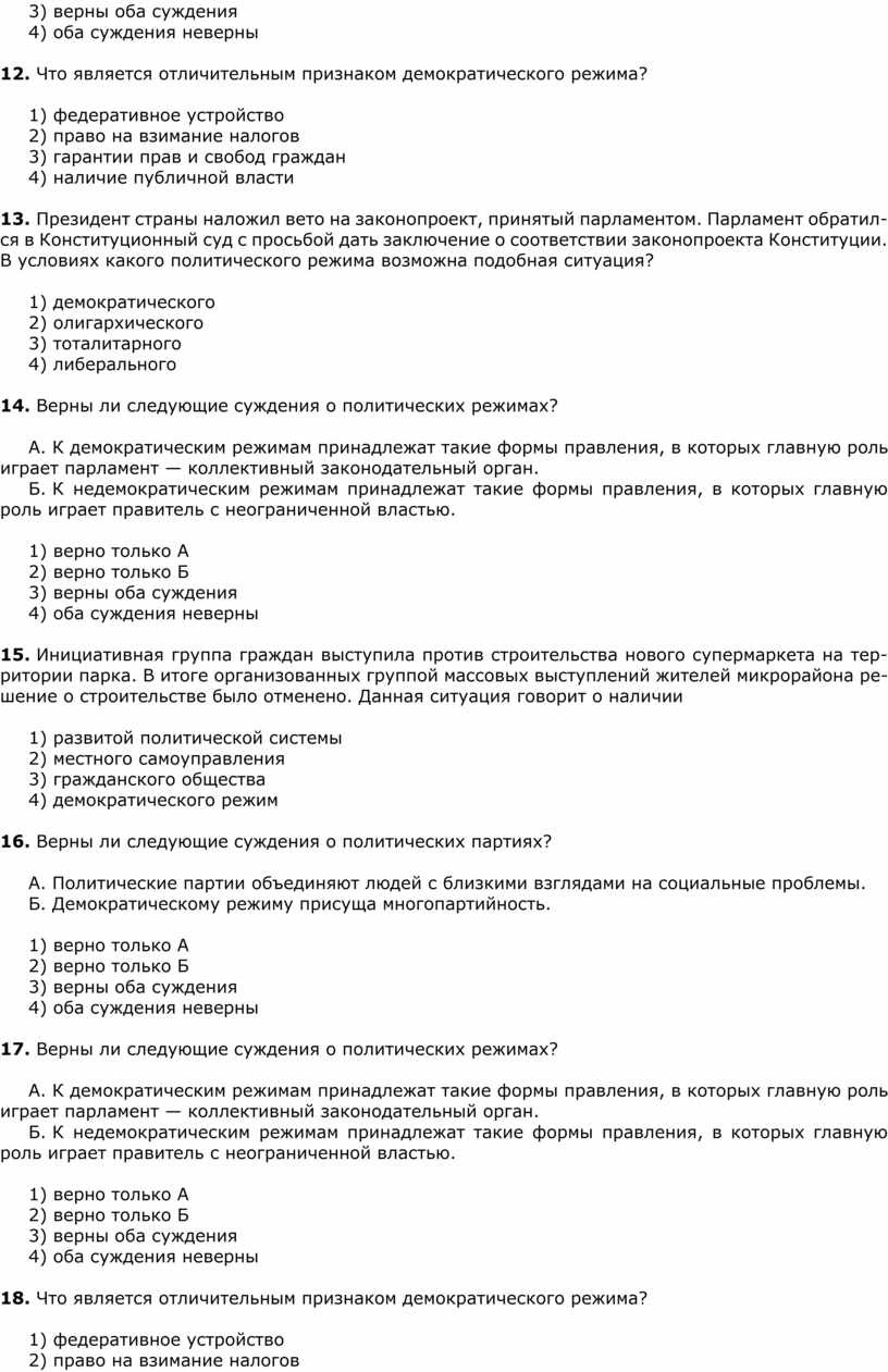 13. Президент страны наложил вето на законопроект, принятый парламентом. Парламент обратился в Конституционный суд с просьбой дать заключение о соответствии законопроекта Конституции. В условиях какого политического режима возможна подобная ситуация?