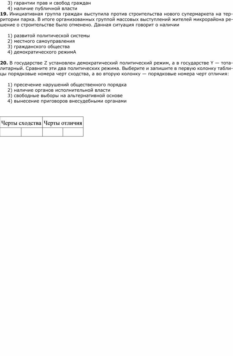 20. В государстве Z установлен демократический политический режим, а в государстве Y — тоталитарный. Сравните эти два политических режима. Выберите и запишите в первую колонку таблицы порядковые номера черт сходства, а во вторую колонку — порядковые номера черт отличия: