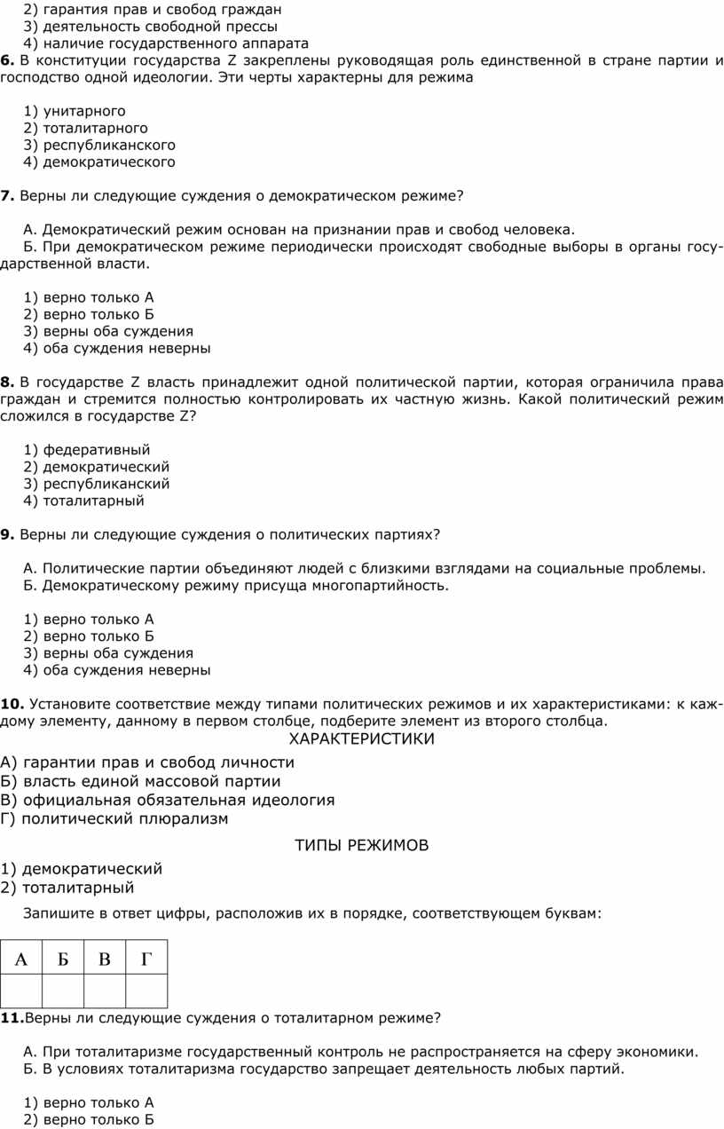 6. В конституции государства Z закреплены руководящая роль единственной в стране партии и господство одной идеологии. Эти черты характерны для режима