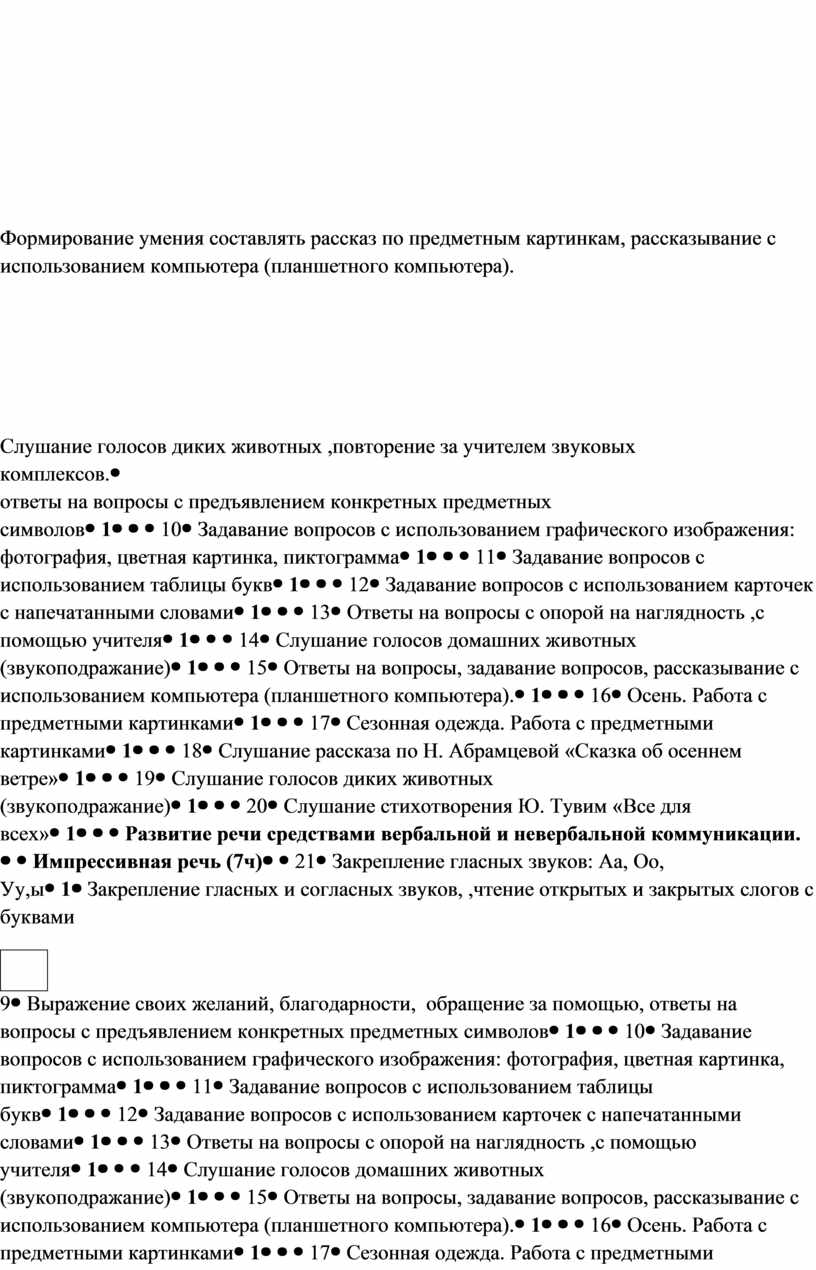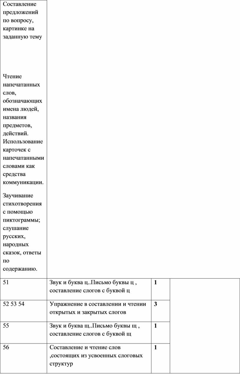 Чтение напечатанных слов, обозначающих имена людей, названия предметов, действий. Использование карточек с напечатанными словами как средства коммуникации. Заучивание стихотворения с помощью пиктограммы; слушание русских, народных сказок, ответы по содержанию. |