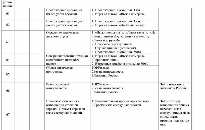 1. знания по физической культуре 2. Строевые упражнения: основная стойка, построения в шеренгу и в колонну по одному, повороты на месте. 3. Ходьба: обычная, на носках, на пятках, с различным положением рук. 4. ОРУ на месте без предметов |