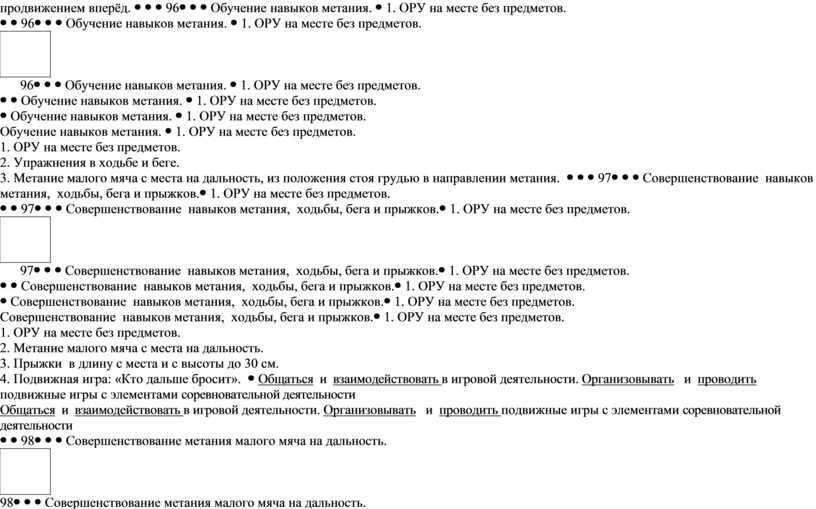 1. ОРУ на месте без предметов. 2. Упражнения в ходьбе и беге. 3. Метание малого мяча с места на дальность, из положения стоя грудью в направлении метания. 4. Игры-эстафеты.