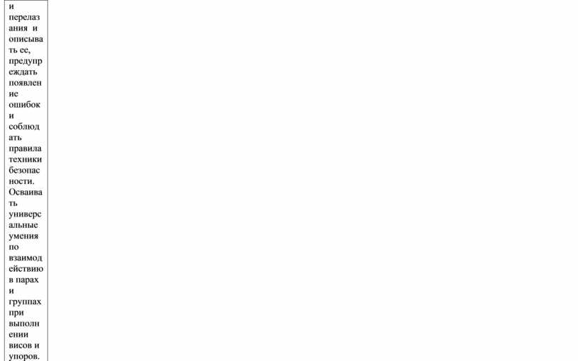 Знать технику выполнения лазанья и перелазания и описывать ее, предупреждать появление ошибок и соблюдать правила техники безопасности. Осваивать универсальные умения по взаимодействию в парах и группах при выполнении висов и упоров. Видеть указанную ошибку и исправлять ее, сохранять заданную цель