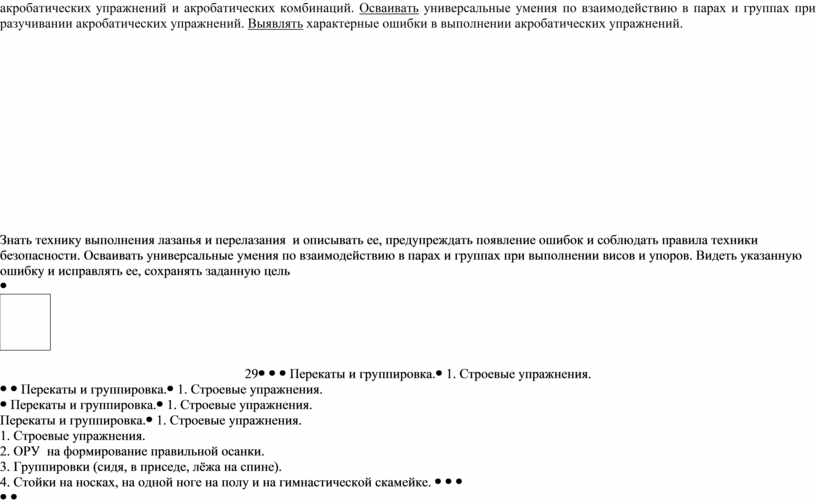 Осваивать технику акробатических упражнений и акробатических комбинаций. Осваивать универсальные умения по взаимодействию в парах и группах при разучивании акробатических упражнений. Выявлять характерные ошибки в выполнении акробатических упражнений.