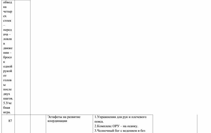 1.Упражнения для рук и плечевого пояса. 2.Комплекс ОРУ – на осанку. 3.Челночный бег с ведением и без ведения мяча. 4. Упражнения на развитие скоростных способностей. 5. Эстафеты с мячом на развитие координации. |