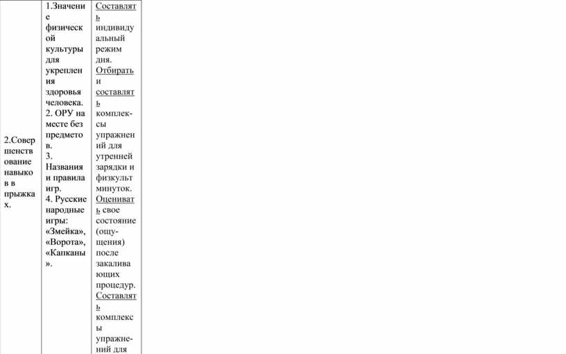 Составлять индивидуальный режим дня. Отбирать и составлять комплексы упражнений для утренней зарядки и физкультминуток. Оценивать свое состояние (ощущения) после закаливающих процедур. Составлять комплексы упражнений для формирования правильной осанки. Моделировать комплексы упражнений с учетом их цели: на развитие силы, быстроты, выносливости