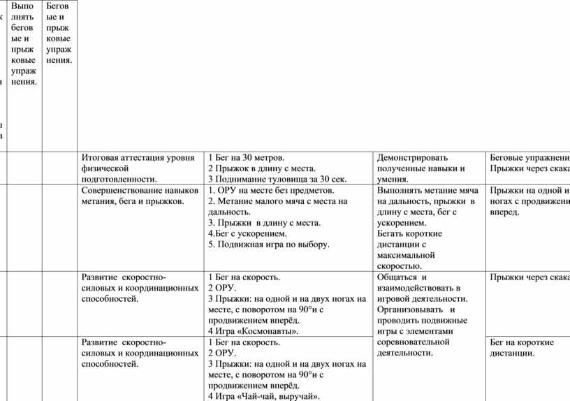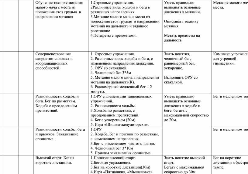 1.Строевые упражнения. 2Различные виды ходьбы и бега в различных направлениях. 3.Метание малого мяча с места из положения стоя грудью в направлении метания на дальность и заданное расстояние 4.Эстафеты с предметами. |