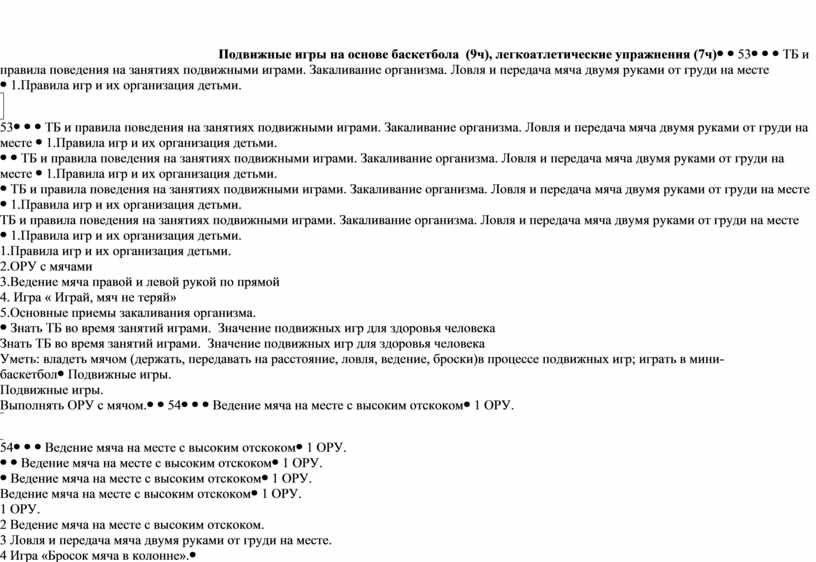 Уметь: владеть мячом (держать, передавать на расстояние, ловля, ведение, броски) в процессе подвижных игр; играть в мини-баскетбол |