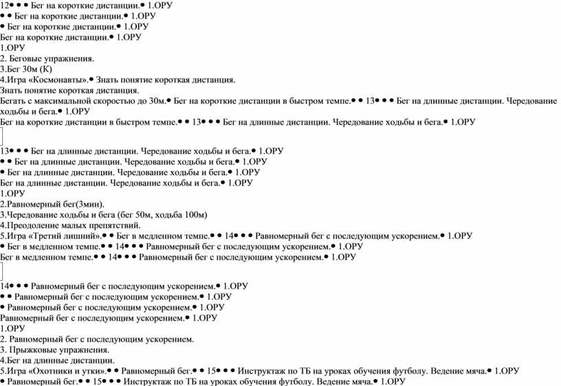 1. Передвижение в колонне по одному на указанные ориентиры. 2. Различные виды ходьбы и бега. 3. ОРУ на месте без предметов. 4. Прыжки: с поворотом на 180°, по разметкам. 5. Бег с ускорением от 10 до 20 м. 6. Равномерный, медленный бег – 2 мин. 7. Эстафеты: «Вызов номеров».