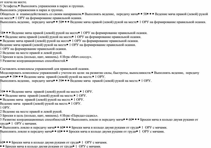 1 ОРУ на формирование правильной осанки. 2 Ведение на месте правой и левой рукой. 3 Броски в цель (кольцо, щит, мишень). 4 Игра «Мяч соседу». 5 Развитие координационных способностей. |