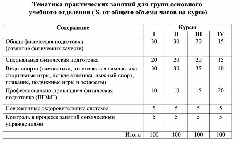 Тематика практических занятий для групп основного учебного отделения (% от общего объема часов на курсе)