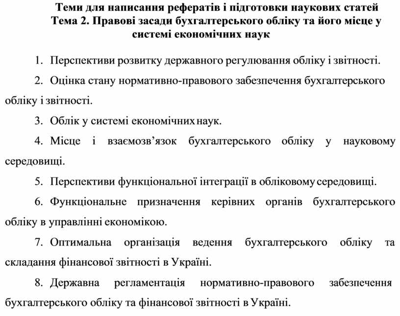 Теми для написання рефератів і підготовки наукових статей Тема 2. Правові засади бухгалтерського обліку та його місце у