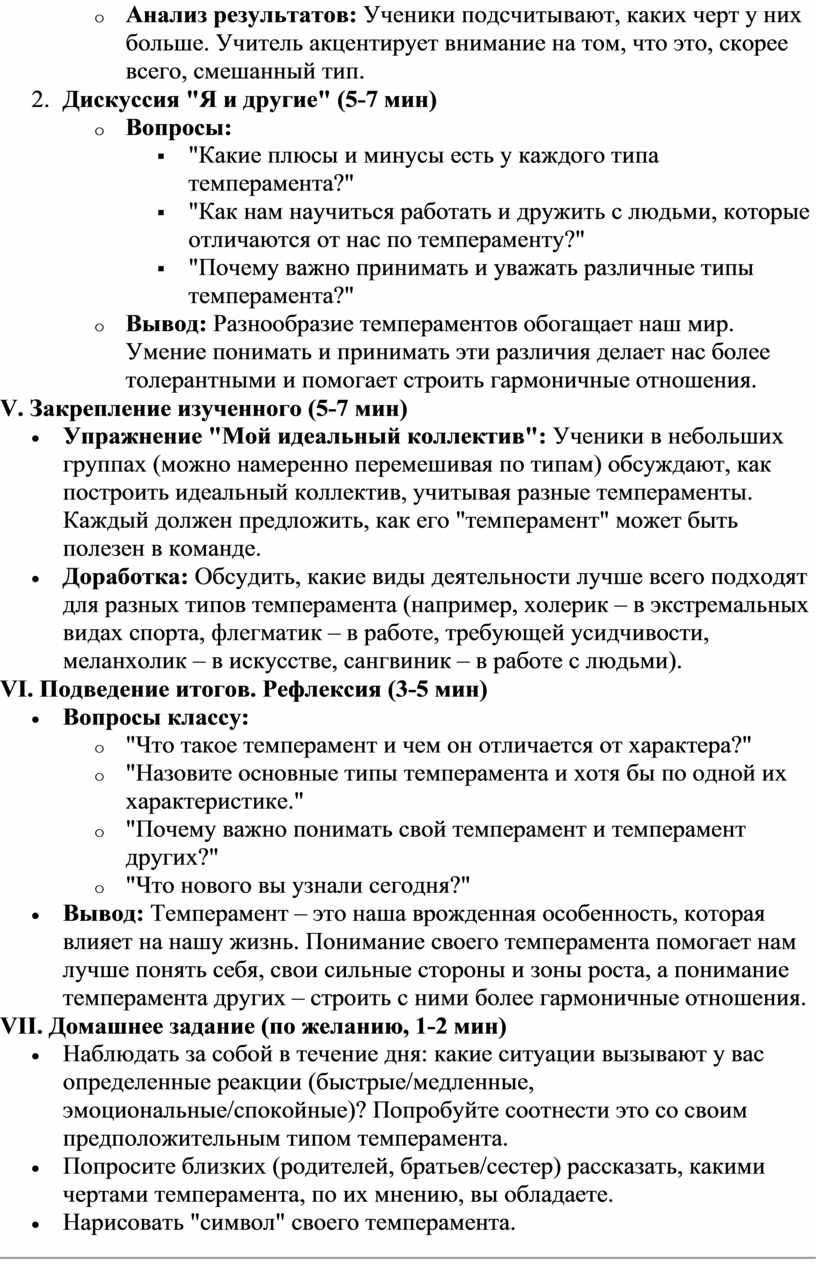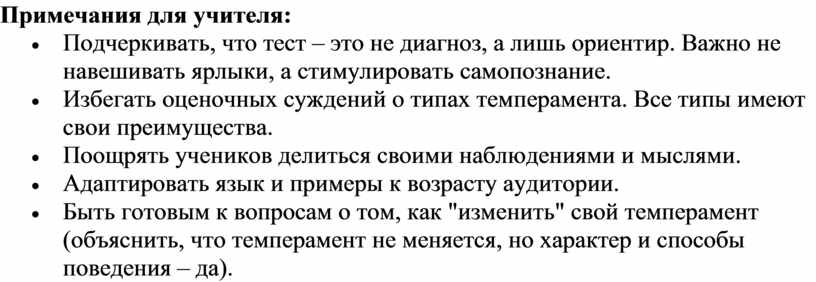 4. Стимулировать учеников к самоанализу и определению своего преобладающего типа темперамента (не как жесткой классификации, а как проявлений).