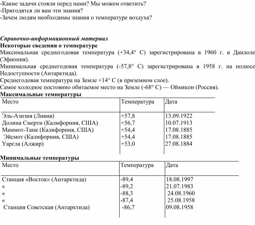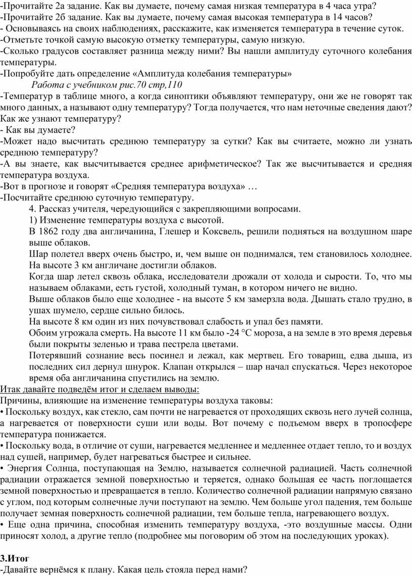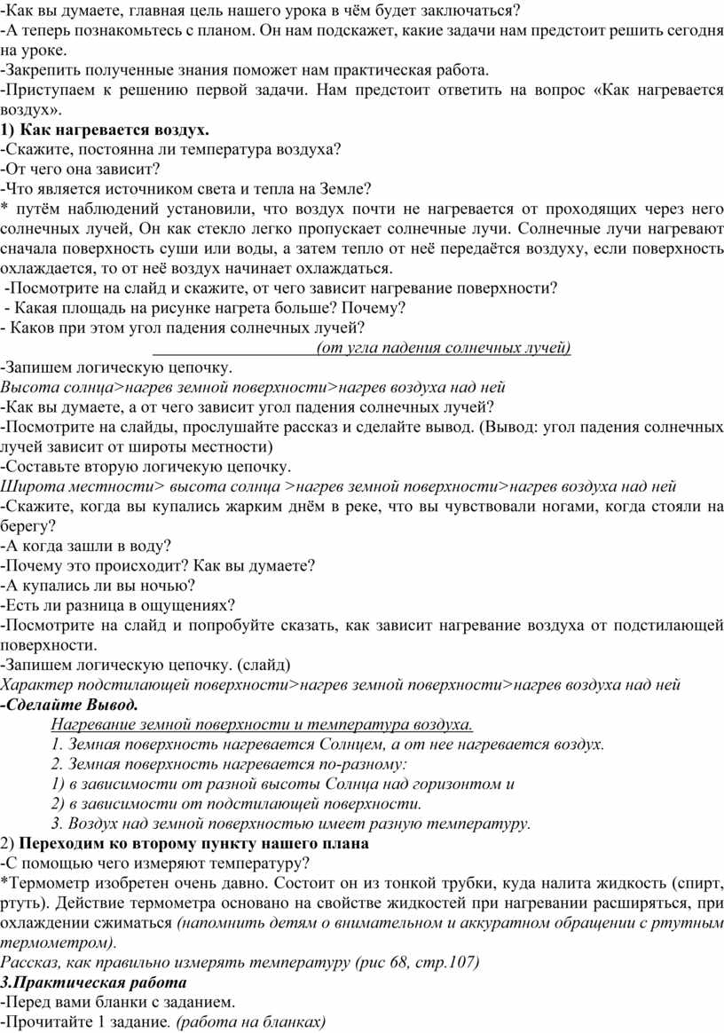 Знакомство с новыми понятиями и определениями; беседа — формирование знаний о температуре воздуха, особенностях ее изменения и измерения; изучение термометра, его устройства и принципов работы; выполнение практических заданий и решение задач по измерению температуры воздуха — вычисление средних показателей и амплитуды.