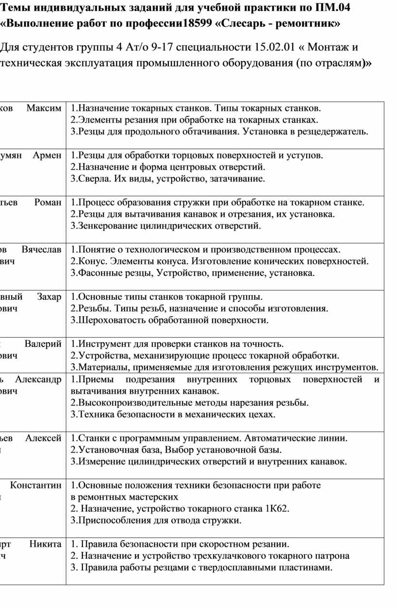 Темы индивидуальных заданий для учебной практики по ПМ.04 «Выполнение работ по профессии18599 «Слесарь - ремонтник»