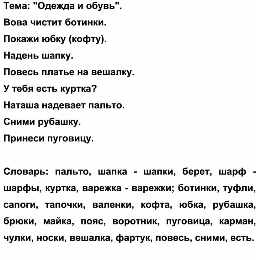 Словарь: пальто, шапка - шапки, берет, шарф - шарфы, куртка, варежка - варежки; ботинки, туфли, сапоги, тапочки, валенки, кофта, юбка, рубашка, брюки, майка, пояс, воротник, пуговица, карман, чулки, носки, вешалка, фартук, повесь, сними, есть.
