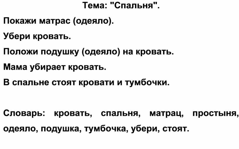 Словарь: кровать, спальня, матрац, простыня, одеяло, подушка, тумбочка, убери, стоят.