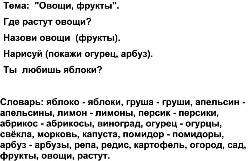 Словарь: яблоко - яблоки, груша - груши, апельсин - апельсины, лимон - лимоны, персик - персики, абрикос - абрикосы, виноград, огурец - огурцы, свёкла, морковь, капуста, помидор - помидоры, арбуз - арбузы, репа, редис, картофель, огород, сад, фрукты, овощи, растут.