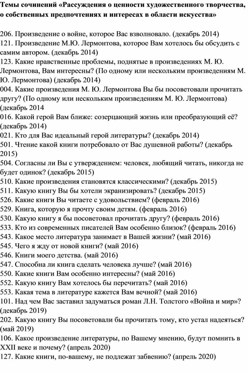 Темы сочинений «Рассуждения о ценности художественного творчества, о собственных предпочтениях и интересах в области искусства»