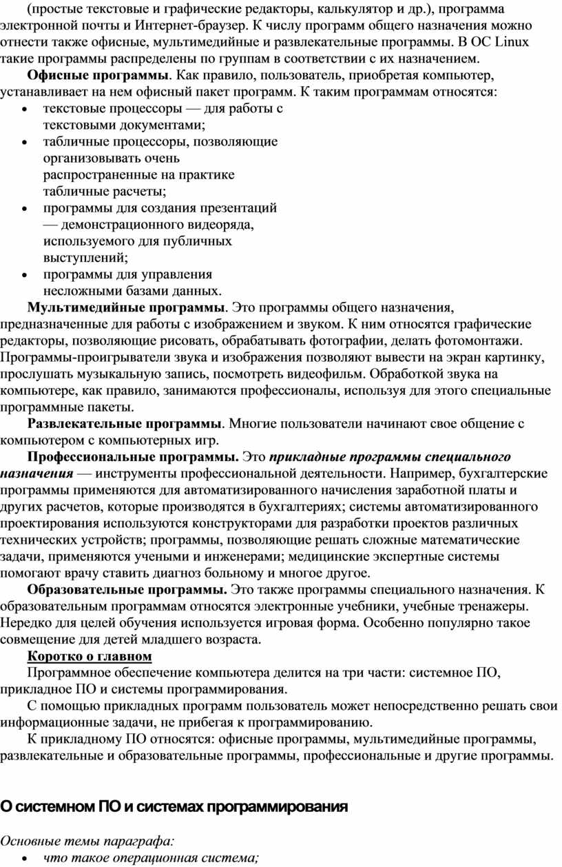 Мультимедийные программы. Это программы общего назначения, предназначенные для работы с изображением и звуком. К ним относятся графические редакторы, позволяющие рисовать, обрабатывать фотографии, делать фотомонтажи. Программы-проигрыватели звука и изображения позволяют вывести на экран картинку, прослушать музыкальную запись, посмотреть видеофильм. Обработкой звука на компьютере, как правило, занимаются профессионалы, используя для этого специальные программные пакеты. Развлекательные программы. Многие пользователи начинают свое общение с компьютером с компьютерных игр. Профессиональные программы. Это прикладные программы специального назначения — инструменты профессиональной деятельности. Например, бухгалтерские программы применяются для автоматизированного начисления заработной платы и других расчетов, которые производятся в бухгалтериях; системы автоматизированного проектирования используются конструкторами для разработки проектов различных технических устройств; программы, позволяющие решать сложные математические задачи, применяются учеными и инженерами; медицинские экспертные системы помогают врачу ставить диагноз больному и многое другое. Образовательные программы. Это также программы специального назначения. К образовательным программам относятся электронные учебники, учебные тренажеры. Нередко для целей обучения используется игровая форма. Особенно популярно такое совмещение для детей младшего возраста. Коротко о главном Программное обеспечение компьютера делится на три части: системное ПО, прикладное ПО и системы программирования. С помощью прикладных программ пользователь может непосредственно решать свои информационные задачи, не прибегая к программированию. К прикладному ПО относятся: офисные программы, мультимедийные программы, развлекательные и образовательные программы, профессиональные и другие программы.