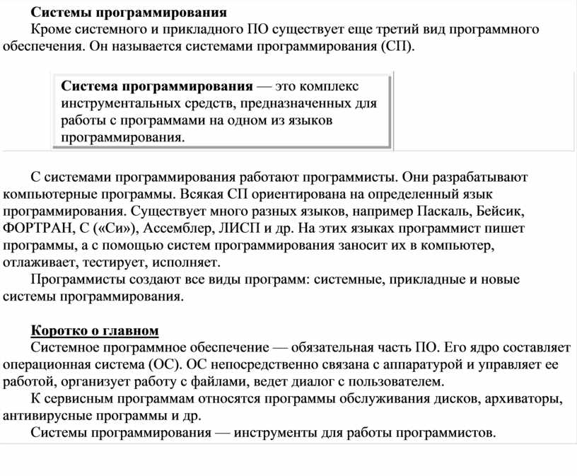 С системами программирования работают программисты. Они разрабатывают компьютерные программы. Всякая СП ориентирована на определенный язык программирования. Существует много разных языков, например Паскаль, Бейсик, ФОРТРАН, С («Си»), Ассемблер, ЛИСП и др. На этих языках программист пишет программы, а с помощью систем программирования заносит их в компьютер, отлаживает, тестирует, исполняет. Программисты создают все виды программ: системные, прикладные и новые системы программирования.