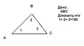 Сумма внутренних углов треугольника равна 180 градусов. Доказательство теоремы. Итак, дан треугольник АВС, нужно доказать, что сумма его внутренних углов А, В, С равна 1800. Давайте оформим конспект. Теорема: Суммавнутренних углов треугольников равна 1800. - Как доказать данную теорему? Перед вами опорная схема, заполните пропуски в ней.