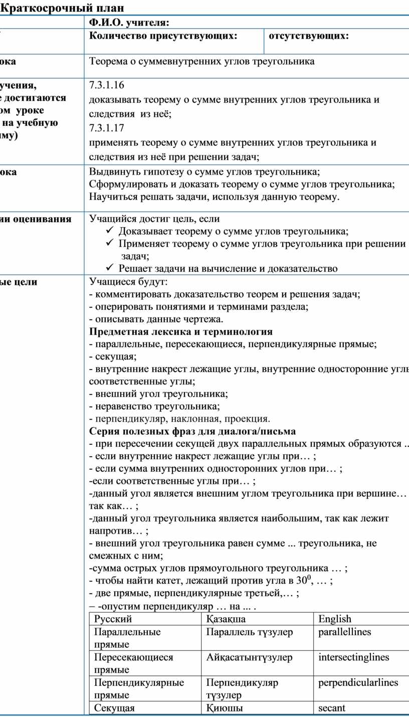 7.3.1.16 доказывать теорему о сумме внутренних углов треугольника и следствия из неё; 7.3.1.17 применять теорему о сумме внутренних углов треугольника и следствия из неё при решении задач; |