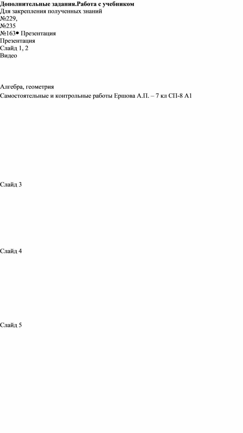 Дополнительные задания.Работа с учебником Для закрепления полученных знаний №229, №235 №163 |