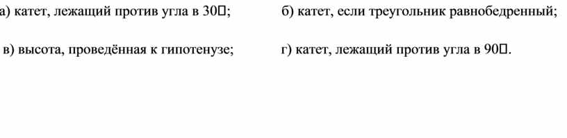 в) высота, проведённая к гипотенузе; г) катет, лежащий против угла в 90.