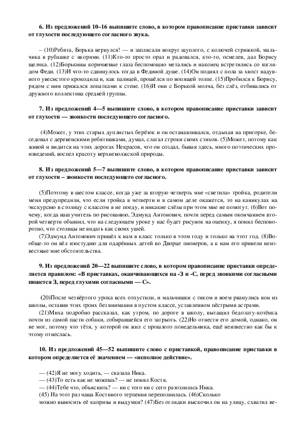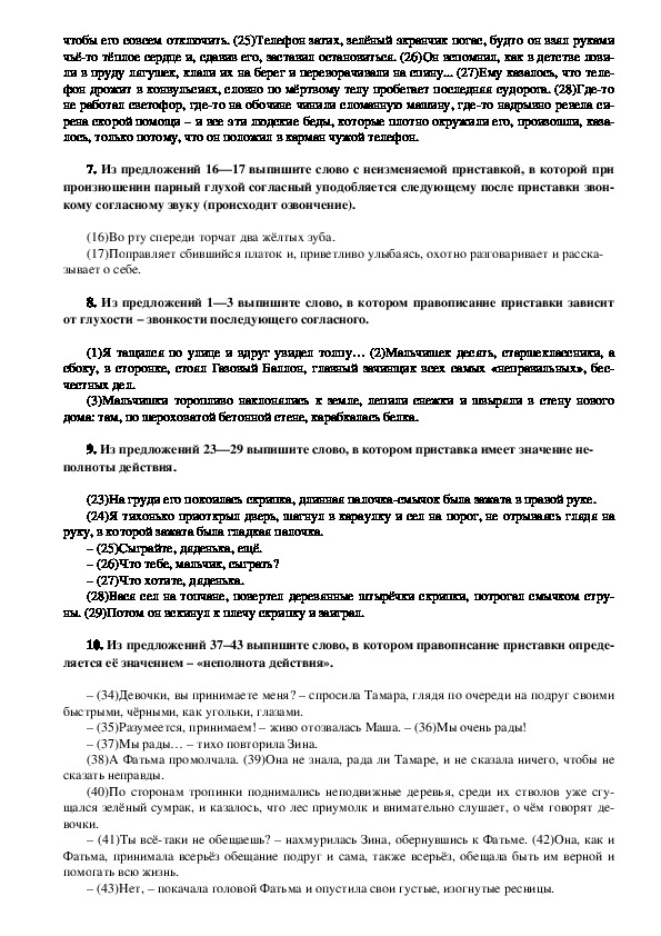 – (43)Нет, – покачала головой Фатьма и опустила свои густые, изогнутые ресницы.Задание № 4. Правописание приставок.