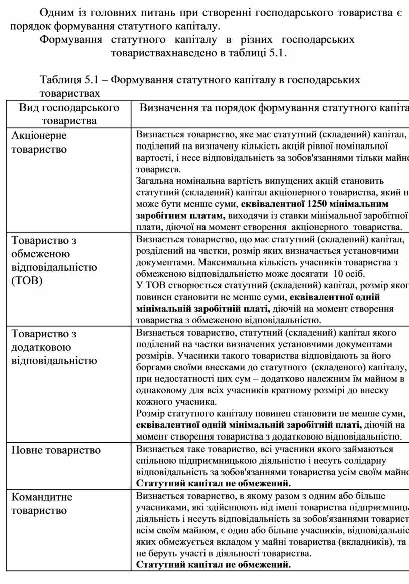 Таблиця 5.1 – Формування статутного капіталу в господарських товариствах