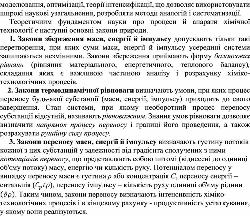 1. Закони збереження маси, енергії й імпульсу допускають тільки такі перетворення, при яких суми маси, енергії й імпульсу усередині системи залишаються незмінними. Закони збереження приймають форму балансових рівнянь (рівняння матеріального, енергетичного, теплового балансу), складання яких є важливою частиною аналізу і розрахунку хіміко-технологічних процесів.