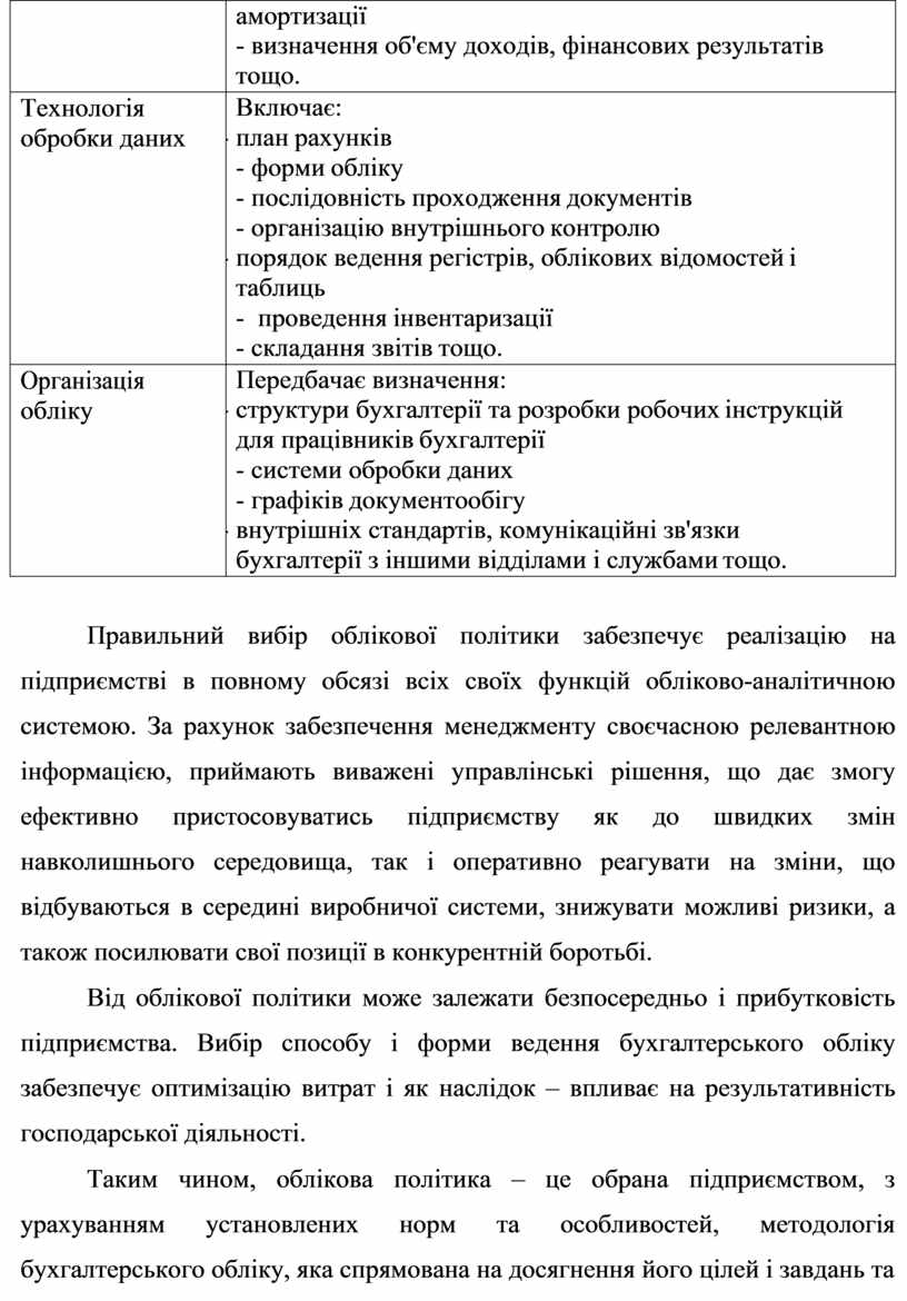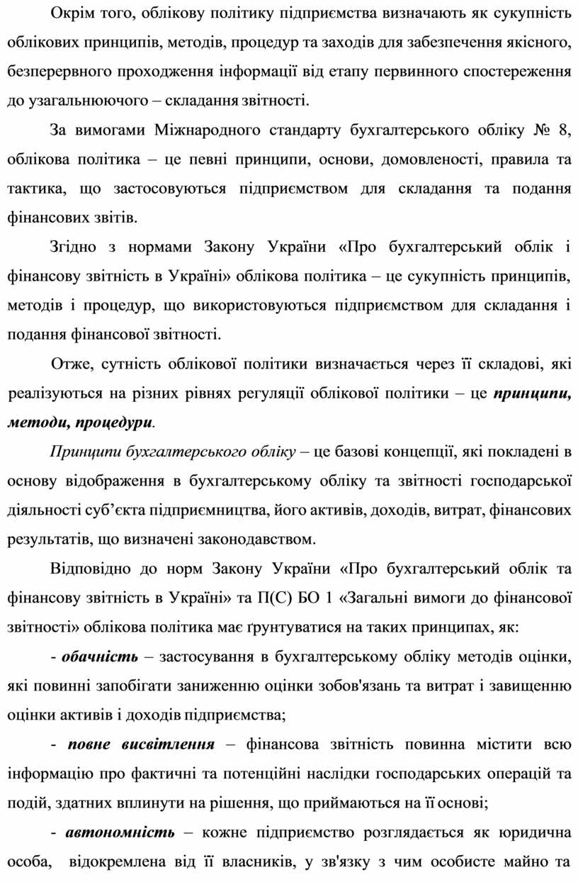 Окрім того, облікову політику підприємства визначають як сукупність облікових принципів, методів, процедур та заходів для забезпечення якісного, безперервного проходження інформації від етапу первинного спостереження до узагальнюючого – складання звітності.