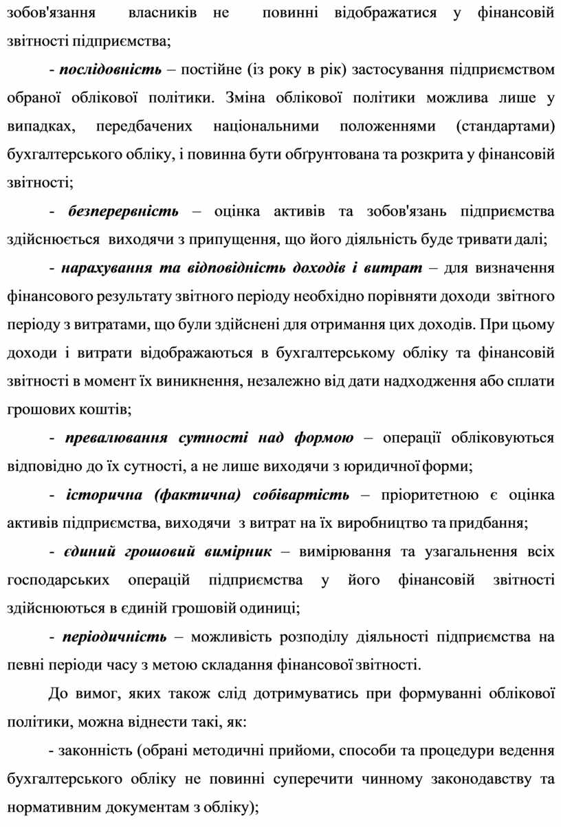 - адекватність (облікова політика підприємства повинна відповідати особливостям умов його діяльності);
