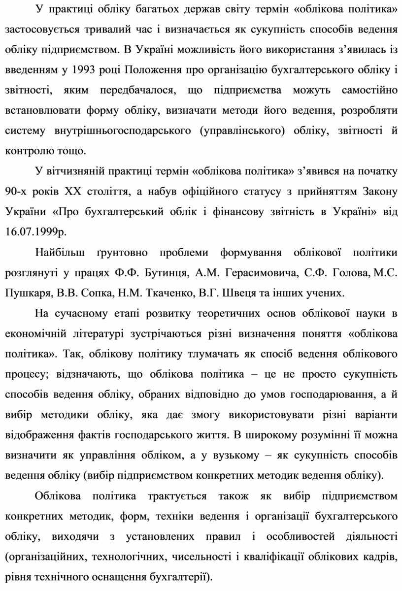 Найбільш ґрунтовно проблеми формування облікової політики розглянуті у працях Ф.Ф. Бутинця, А.М. Герасимовича, С.Ф. Голова, М.С. Пушкаря, В.В. Сопка, Н.М. Ткаченко, В.Г. Швеця та інших учених.