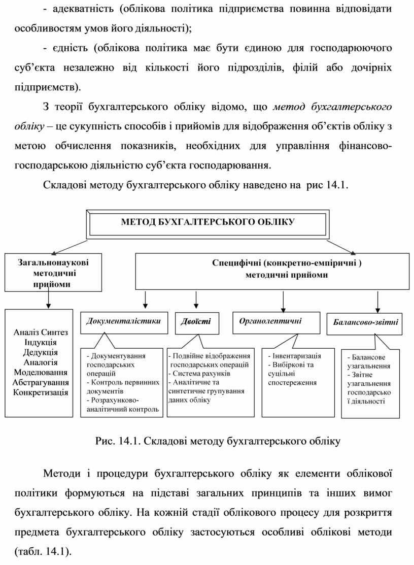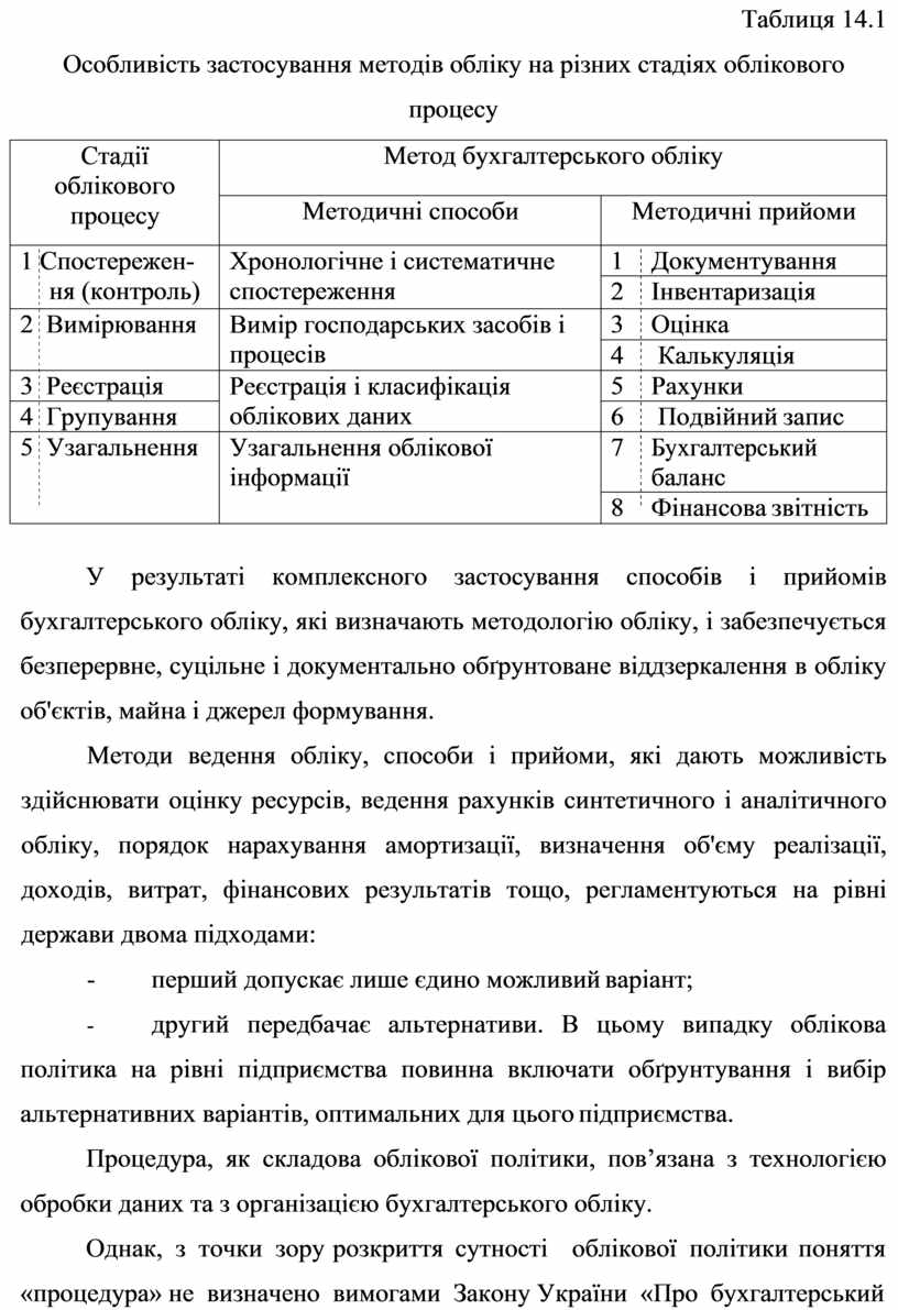 Методи і процедури бухгалтерського обліку як елементи облікової політики формуються на підставі загальних принципів та інших вимог бухгалтерського обліку. На кожній стадії облікового процесу для розкриття предмета бухгалтерського обліку застосуються особливі облікові методи (табл. 14.1).