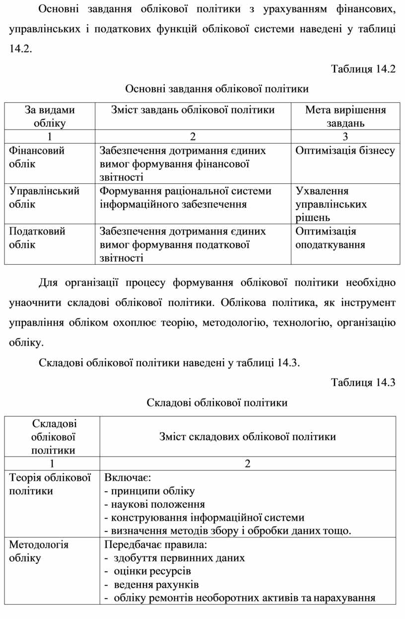 Основні завдання облікової політики з урахуванням фінансових, управлінських і податкових функцій облікової системи наведені у таблиці 14.2.