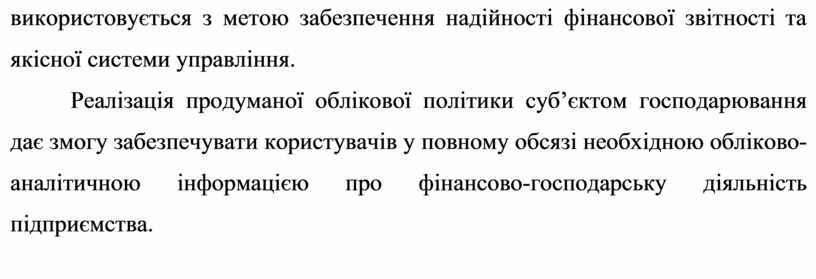 Реалізація продуманої облікової політики суб’єктом господарювання дає змогу забезпечувати користувачів у повному обсязі необхідною обліково- аналітичною інформацією про фінансово-господарську діяльність підприємства.