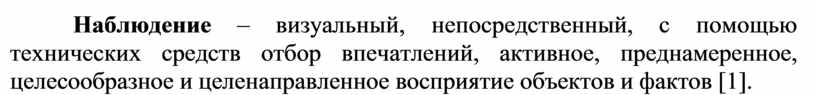 Наблюдение – визуальный, непосредственный, с помощью технических средств отбор впечатлений, активное, преднамеренное, целесообразное и целенаправленное восприятие объектов и фактов [1].