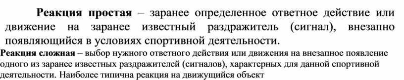 Реакция простая – заранее определенное ответное действие или движение на заранее известный раздражитель (сигнал), внезапно появляющийся в условиях спортивной деятельности.