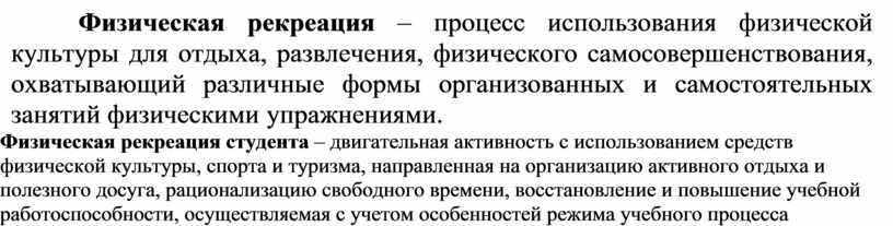Физическая рекреация студента – двигательная активность с использованием средств физической культуры, спорта и туризма, направленная на организацию активного отдыха и полезного досуга, рационализацию свободного времени, восстановление и повышение учебной работоспособности, осуществляемая с учетом особенностей режима учебного процесса