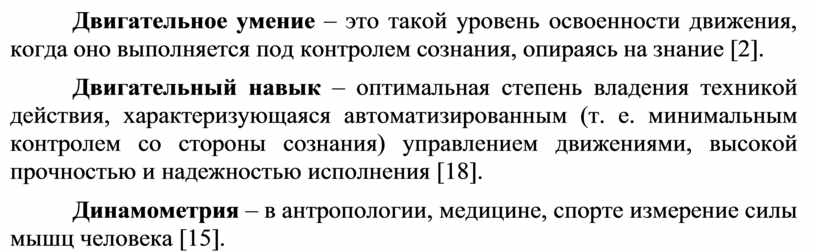 Двигательный навык – оптимальная степень владения техникой действия, характеризующаяся автоматизированным (т. е. минимальным контролем со стороны сознания) управлением движениями, высокой прочностью и надежностью исполнения [18].