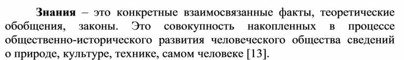 Знания – это конкретные взаимосвязанные факты, теоретические обобщения, законы. Это совокупность накопленных в процессе общественно-исторического развития человеческого общества сведений о природе, культуре, технике, самом человеке [13].