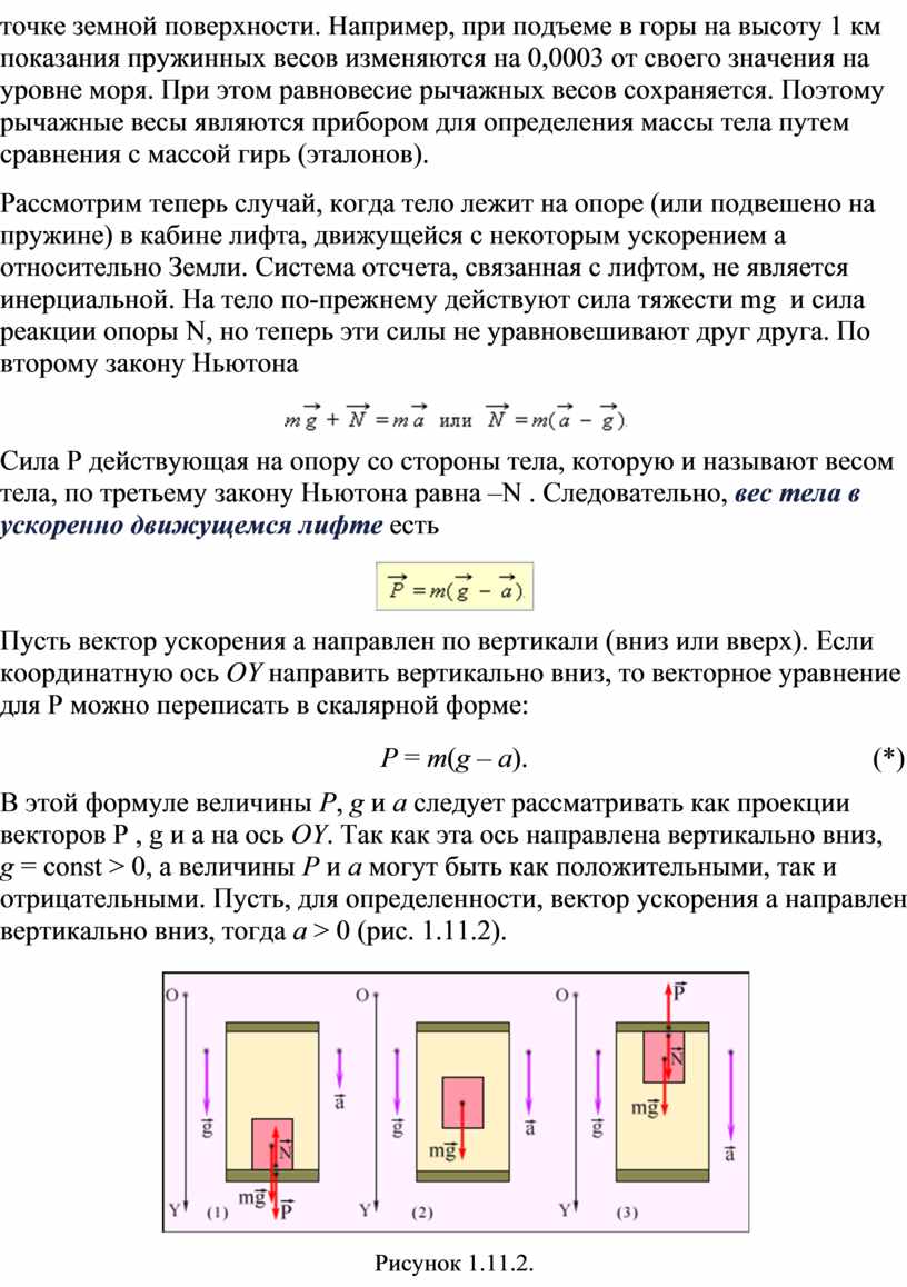 В этой формуле величины P, g и a следует рассматривать как проекции векторов P , g и a на ось OY. Так как эта ось направлена вертикально вниз, g = const > 0, а величины P и a могут быть как положительными, так и отрицательными. Пусть, для определенности, вектор ускорения a направлен вертикально вниз, тогда a > 0 (рис. 1.11.2).